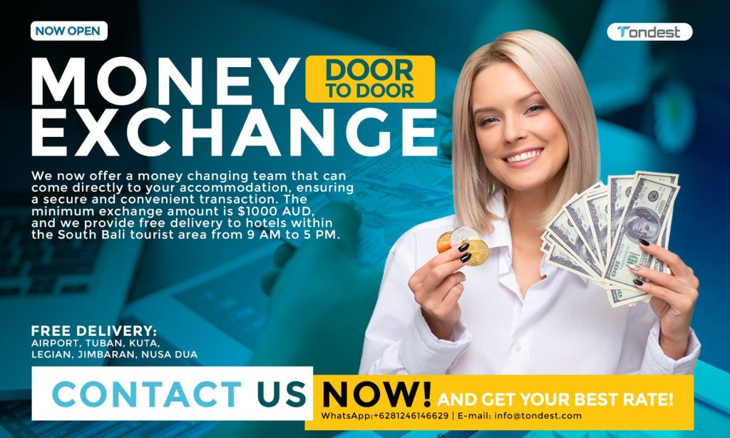 We now offer a money changing team that can come directly to your accommodation, ensuring a secure and convenient transaction. The minimum exchange amount is $1000 AUD, and we provide free delivery to hotels within the South Bali tourist area from 9 AM to 5 PM.